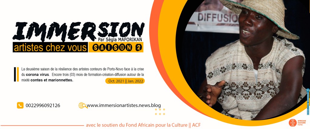 Le projet Immersion, pour rappel est un projet de renforcement de capacité des artistes conteurs de Porto-Novo et leur initiation à la marionnette en vue de produire des spectacle ludiques et éducatifs à diffuser essentiellement dans les maisons de Porto-Novo et environs. Ce projet a vu le jour en 2020 grâce à SOFACO lot 1 et sa première saison s’est tenue d’octobre 2020 à Janvier 2021. il a permis de parcourir plus d’une dizaine de maison et de toucher directement plus de 300 spectacteurs depuis leur maison qui ont, tout en se régalant du spectacle, été sensibilisés sur les gestes barrières liés à la Covid_19.